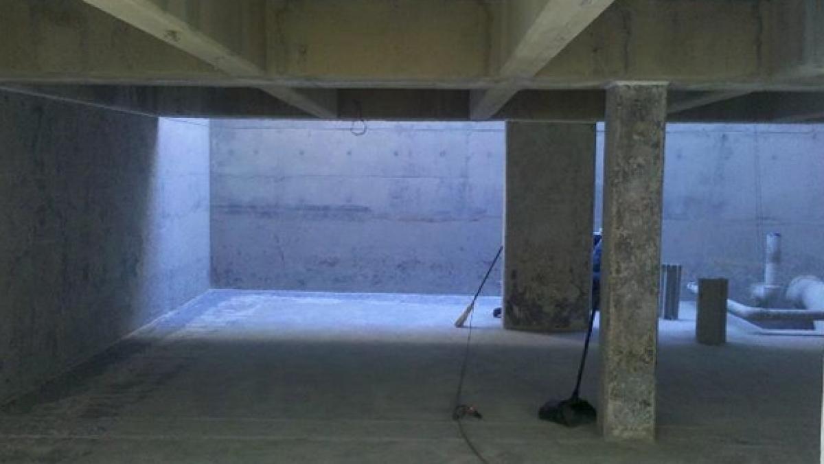 The area was cleaned with high pressure (5000 psi) water wash which partially removed the existing epoxy coating. The remaining epoxy coating was removed with power tools and the concrete was abraded to achieve sufficient profile. Freedomtuff 6160 epoxy primer was applied at 5 mils. A 20 grit aggregate was lightly thrown onto the wet primed walls to allow for maximum mechanical adhesion. Freedomtuff 2202 was applied at 100 mils.